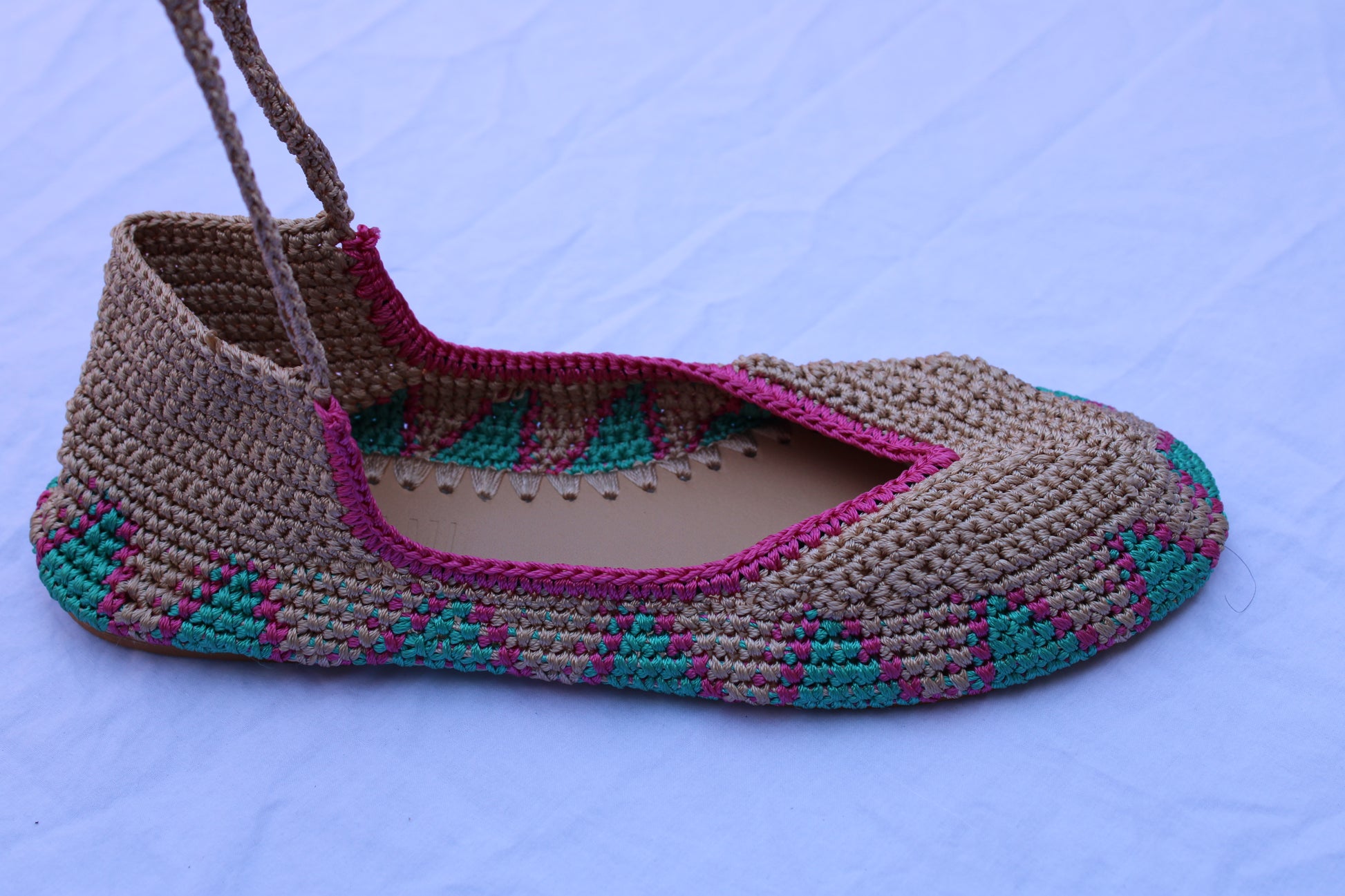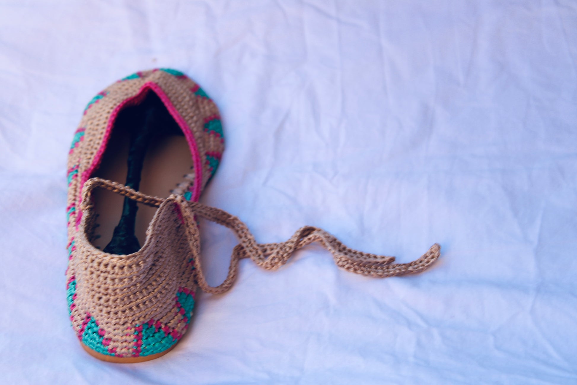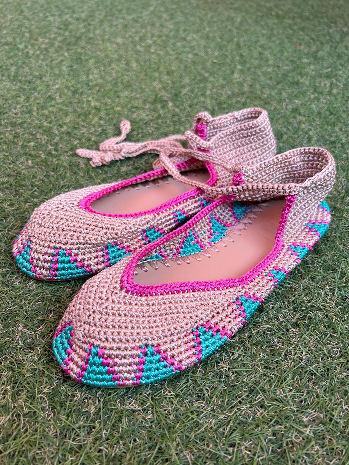 Bailarinas planas de punto crochet tejidas a mano en color beige, rosa y turquesa, con cierre de tiras romanas. Están realizadas en algodón y rayón teñidos a mano con tintes naturales. La plantilla interior es de cuero, y la suela de cuero y goma. Se ajustan muy bien al pie, son realmente cómodas.