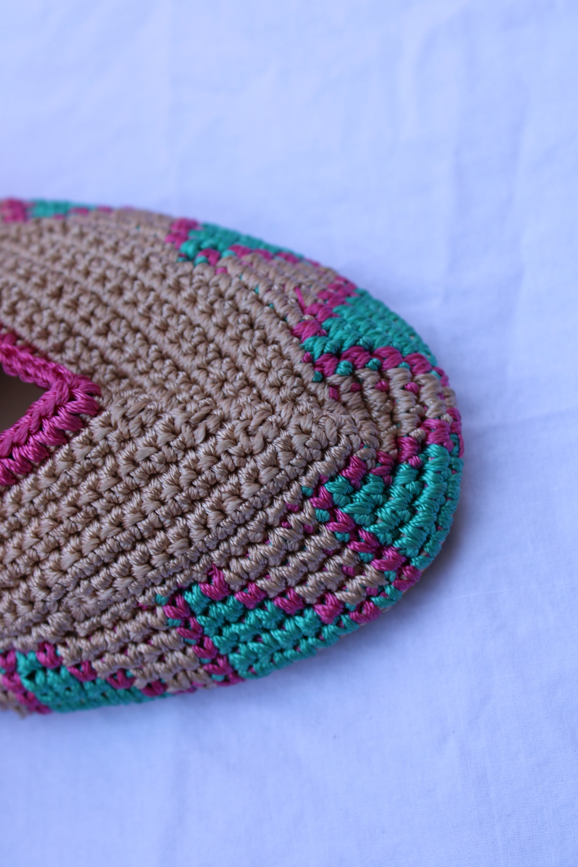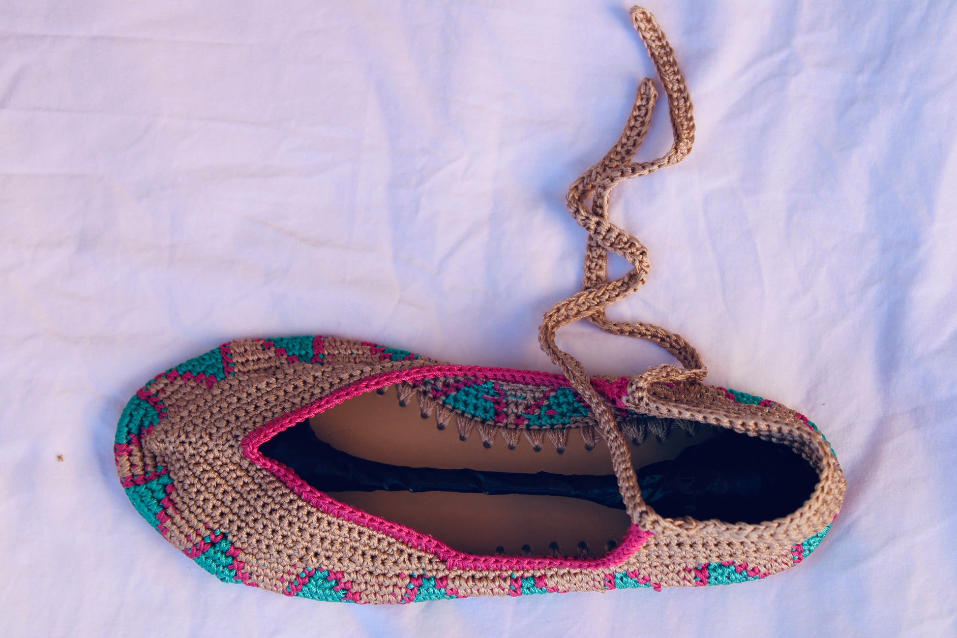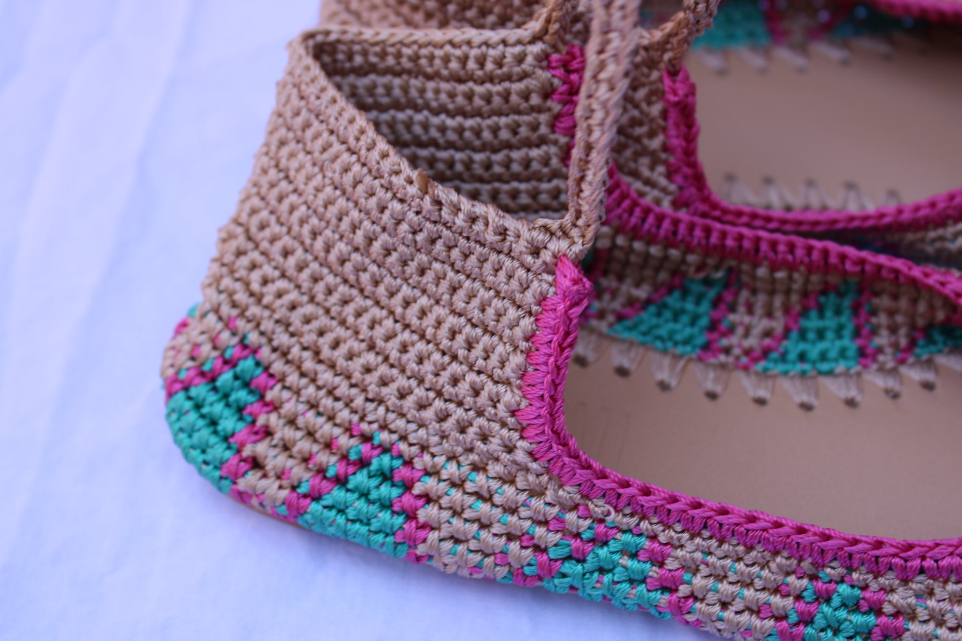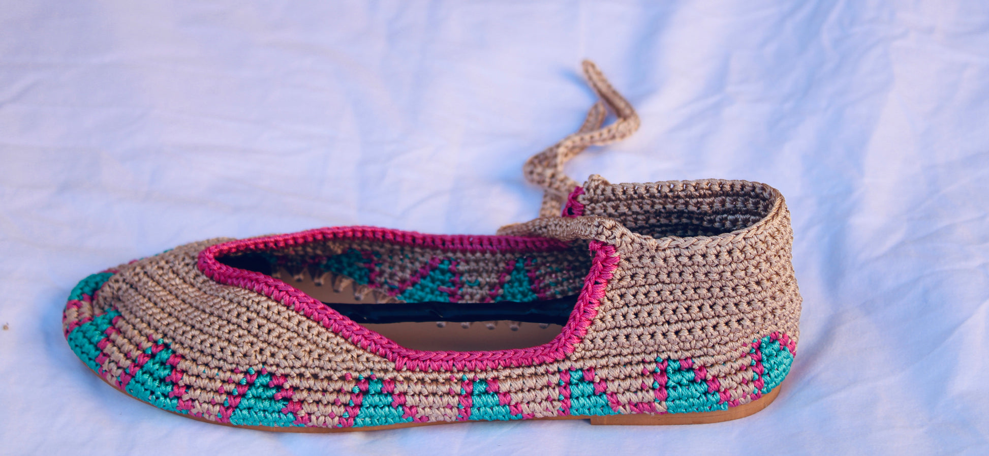 Bailarinas planas de punto crochet tejidas a mano en color beige, rosa y turquesa, con cierre de tiras romanas. Están realizadas en algodón y rayón teñidos a mano con tintes naturales. La plantilla interior es de cuero, y la suela de cuero y goma. Se ajustan muy bien al pie, son realmente cómodas.