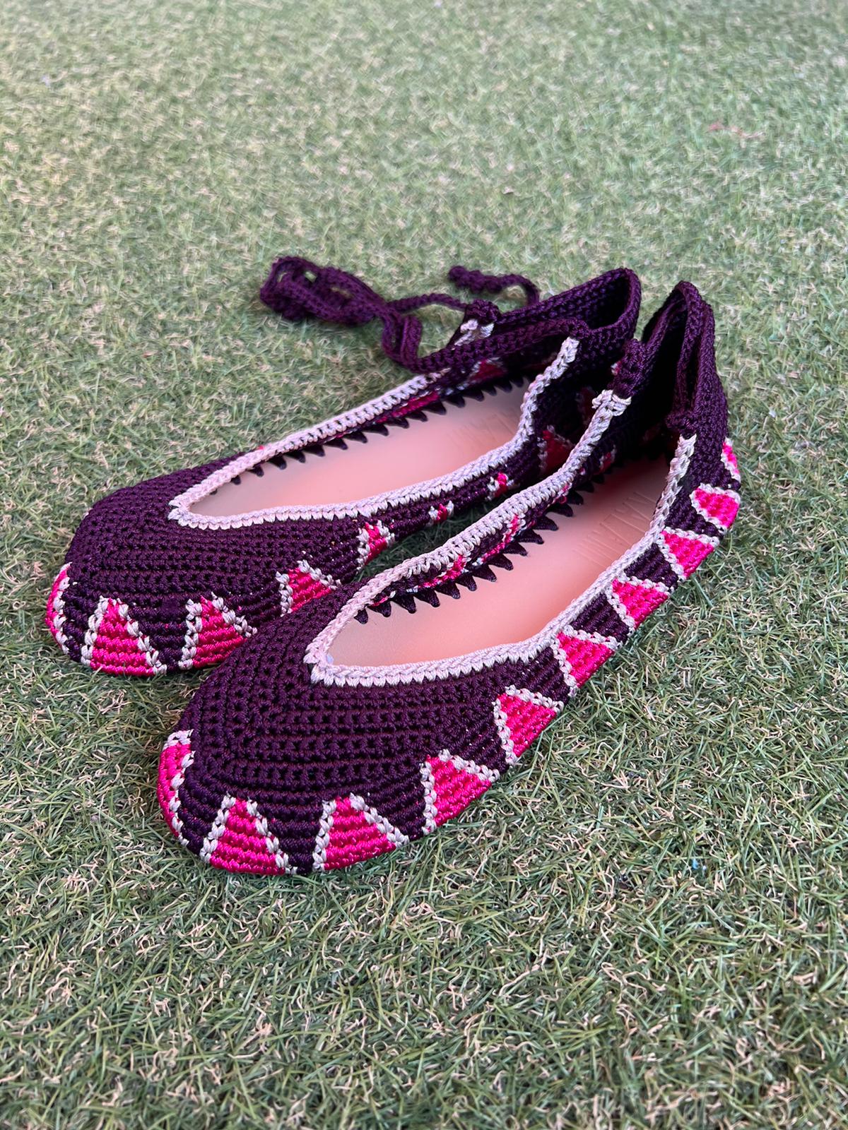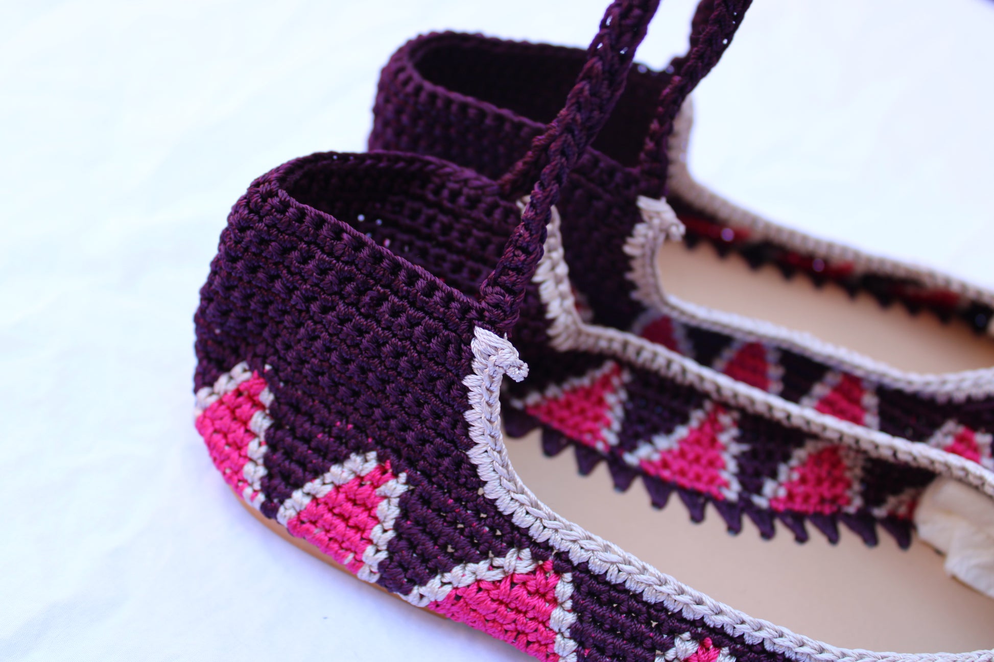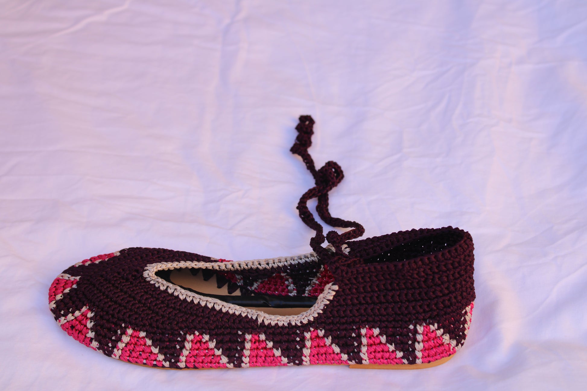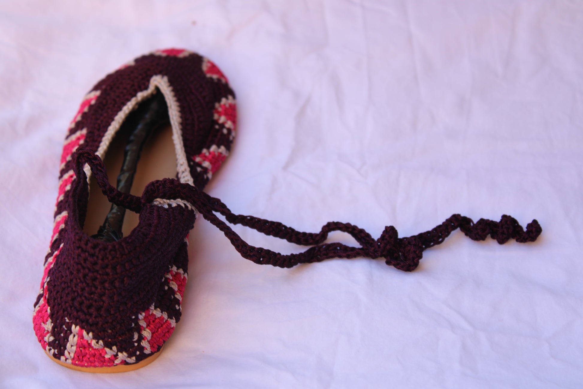Bailarinas planas de punto crochet tejidas a mano en color vino y rosa, con cierre de tiras romanas. Están realizadas en algodón y rayón teñidos a mano con tintes naturales. La plantilla interior es de cuero, y la suela de cuero y goma. Se ajustan muy bien al pie, son realmente cómodas.
