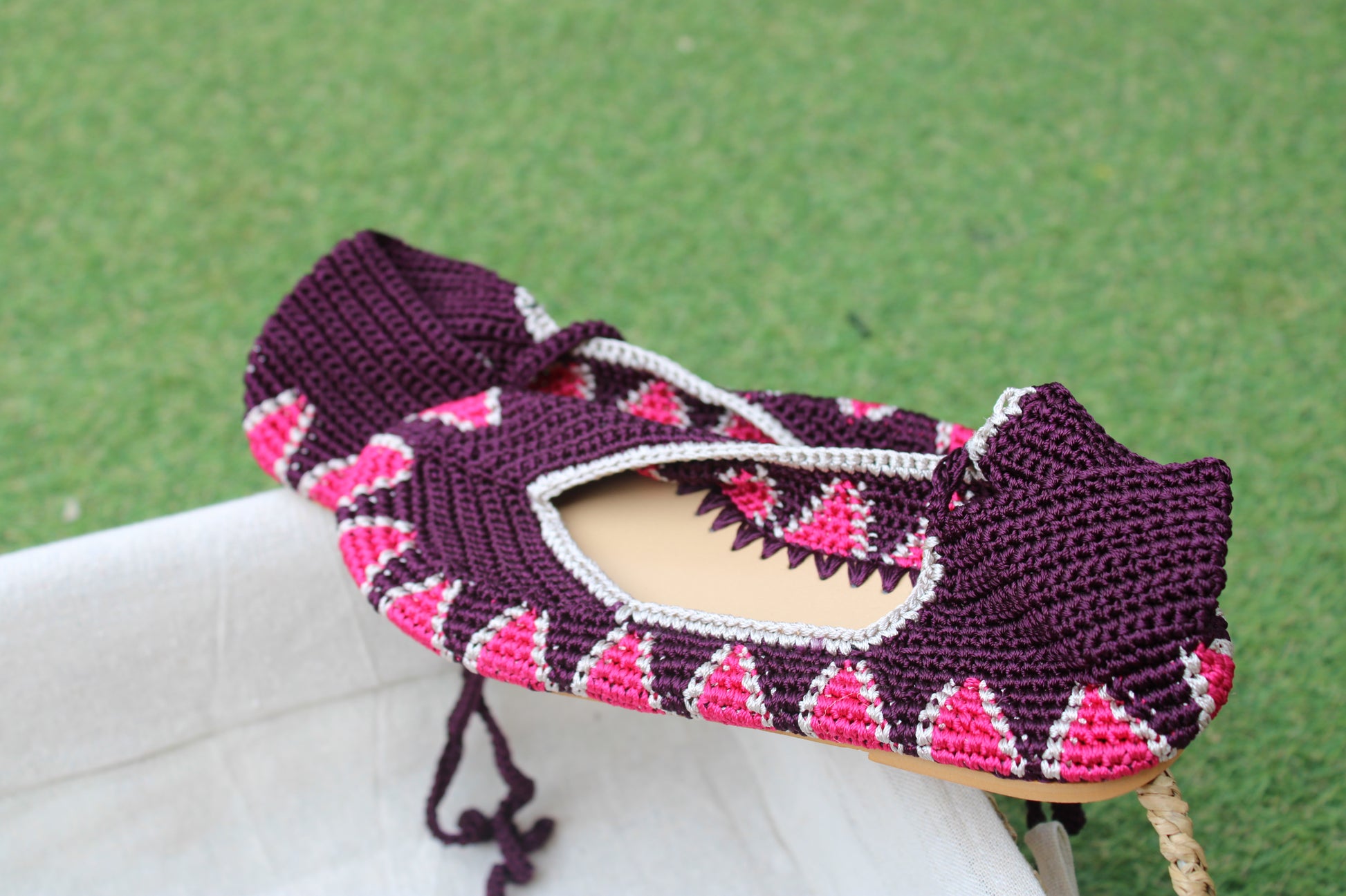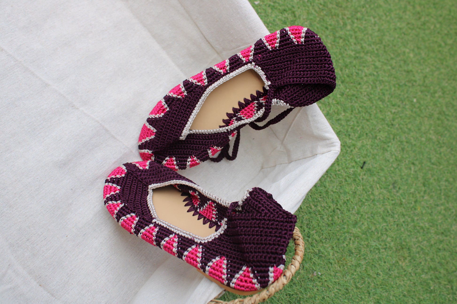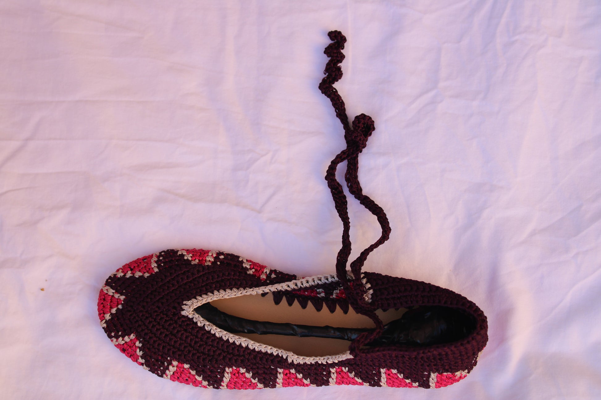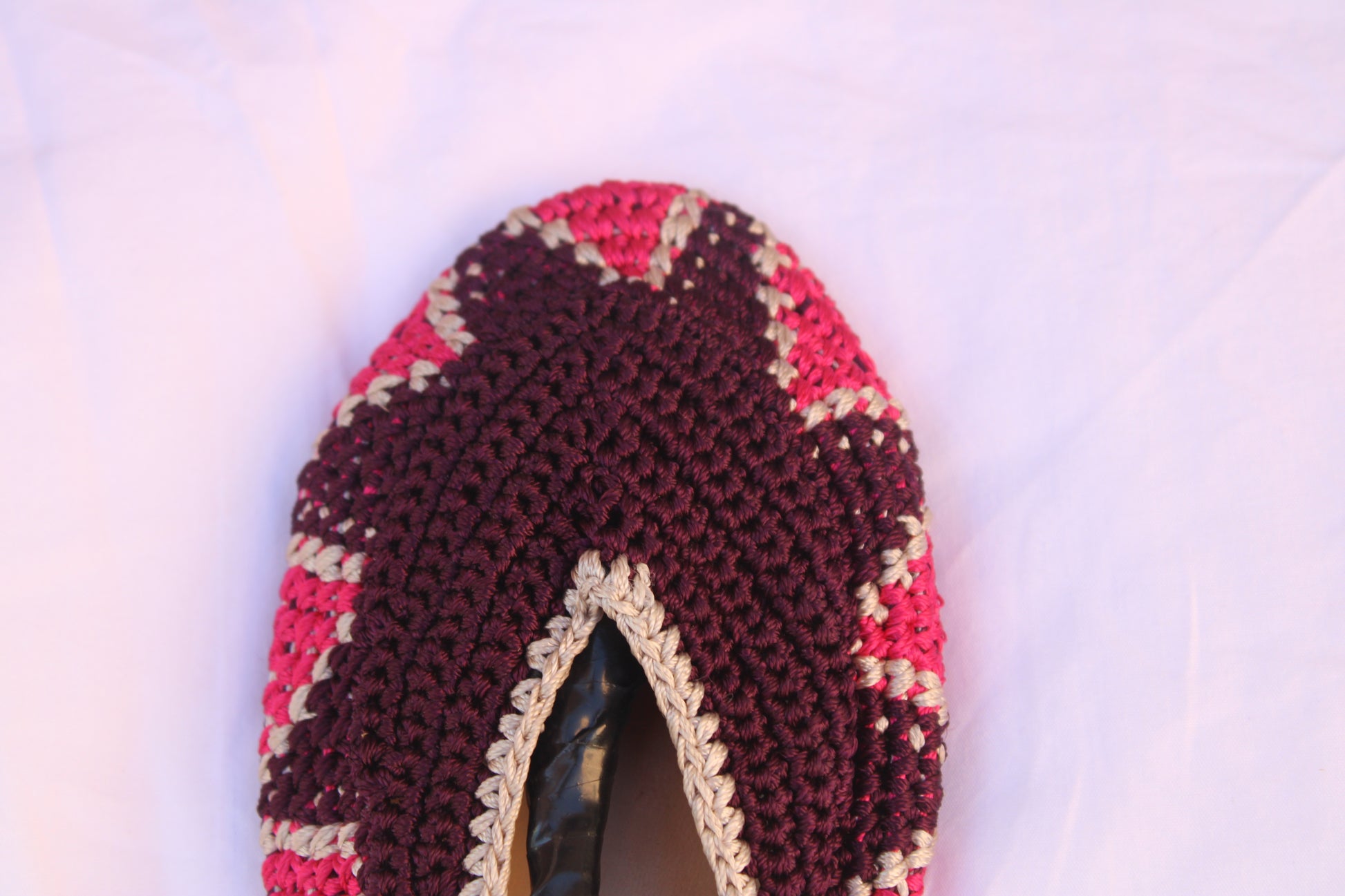 Bailarinas planas de punto crochet tejidas a mano en color vino y rosa, con cierre de tiras romanas. Están realizadas en algodón y rayón teñidos a mano con tintes naturales. La plantilla interior es de cuero, y la suela de cuero y goma. Se ajustan muy bien al pie, son realmente cómodas.