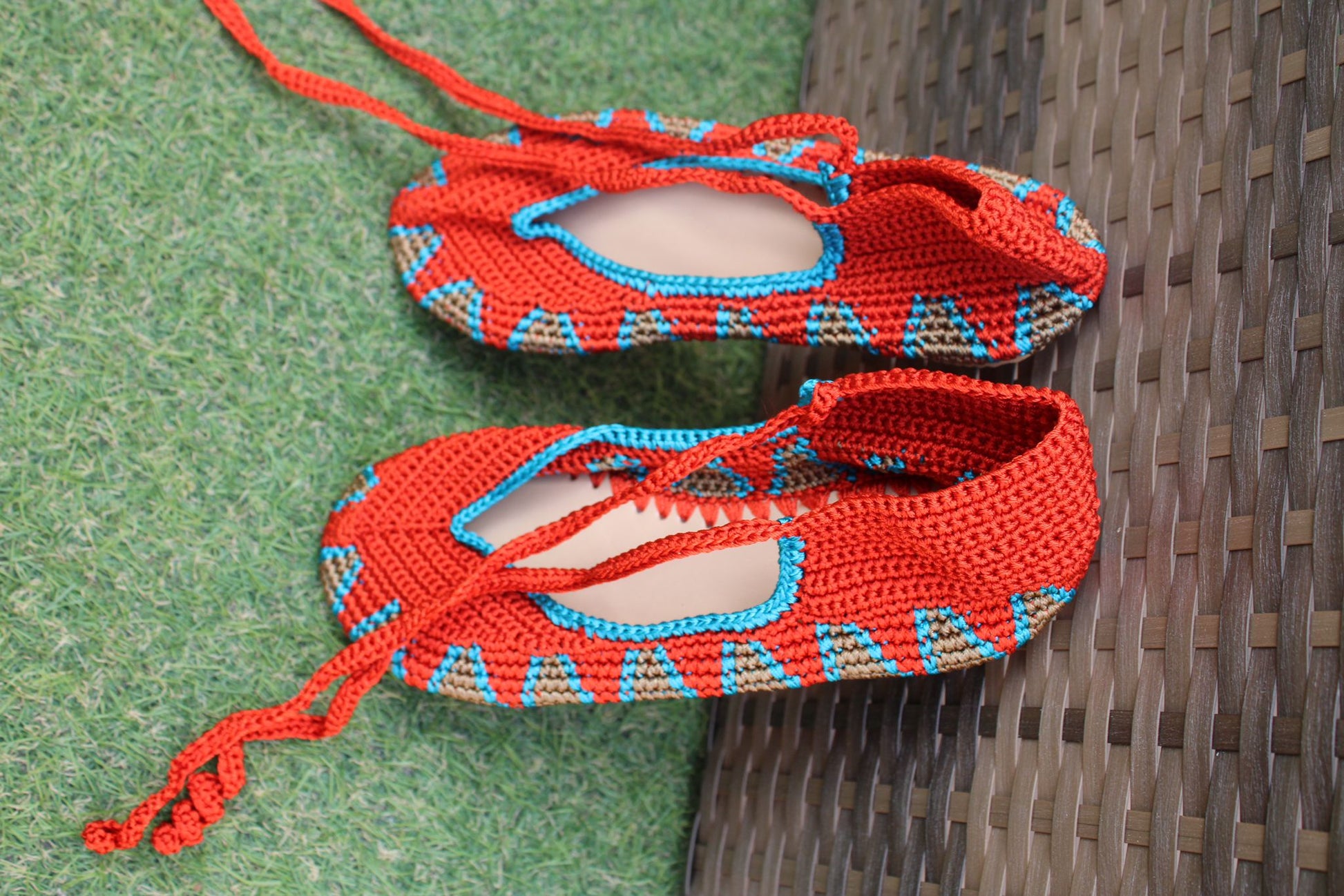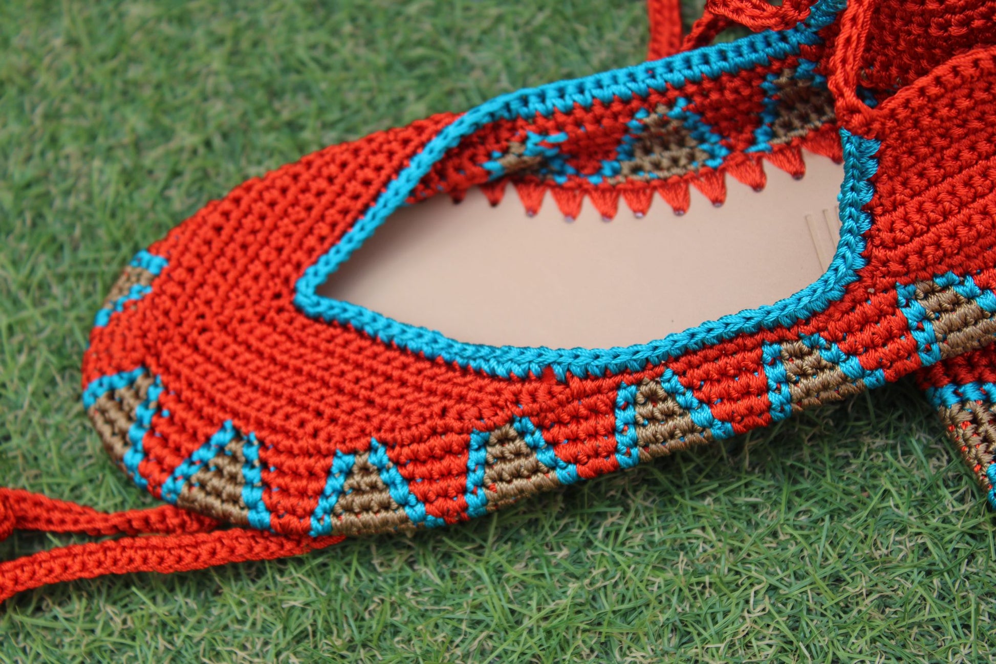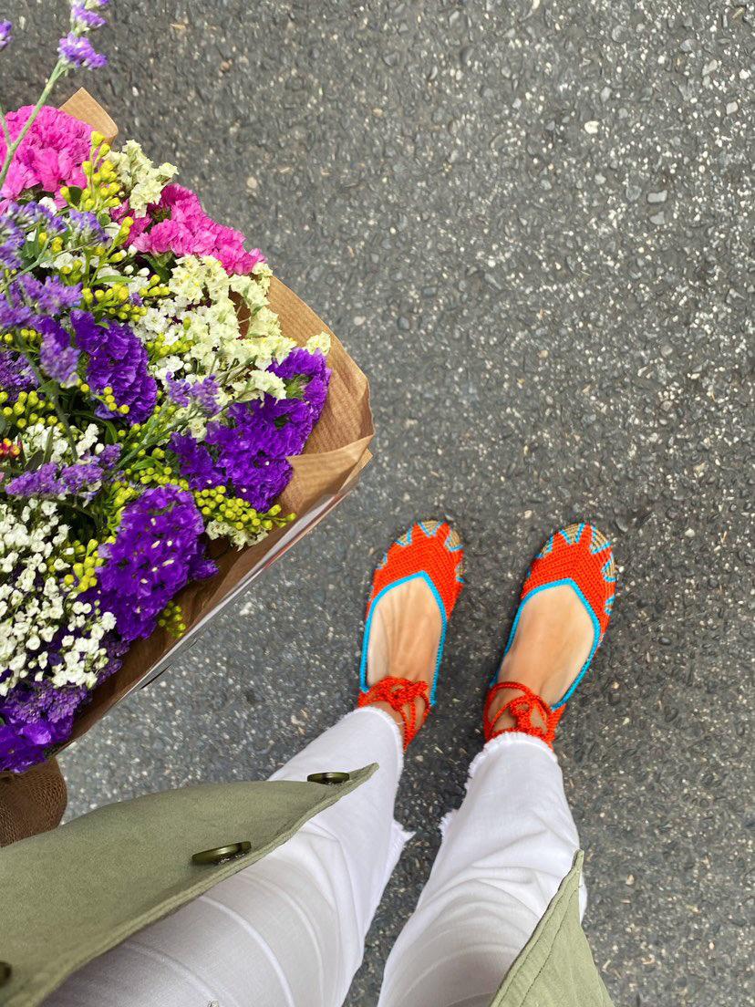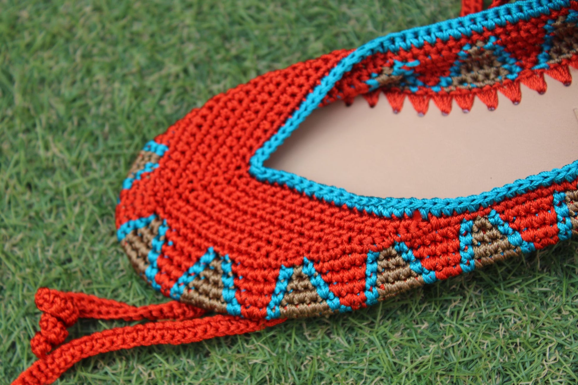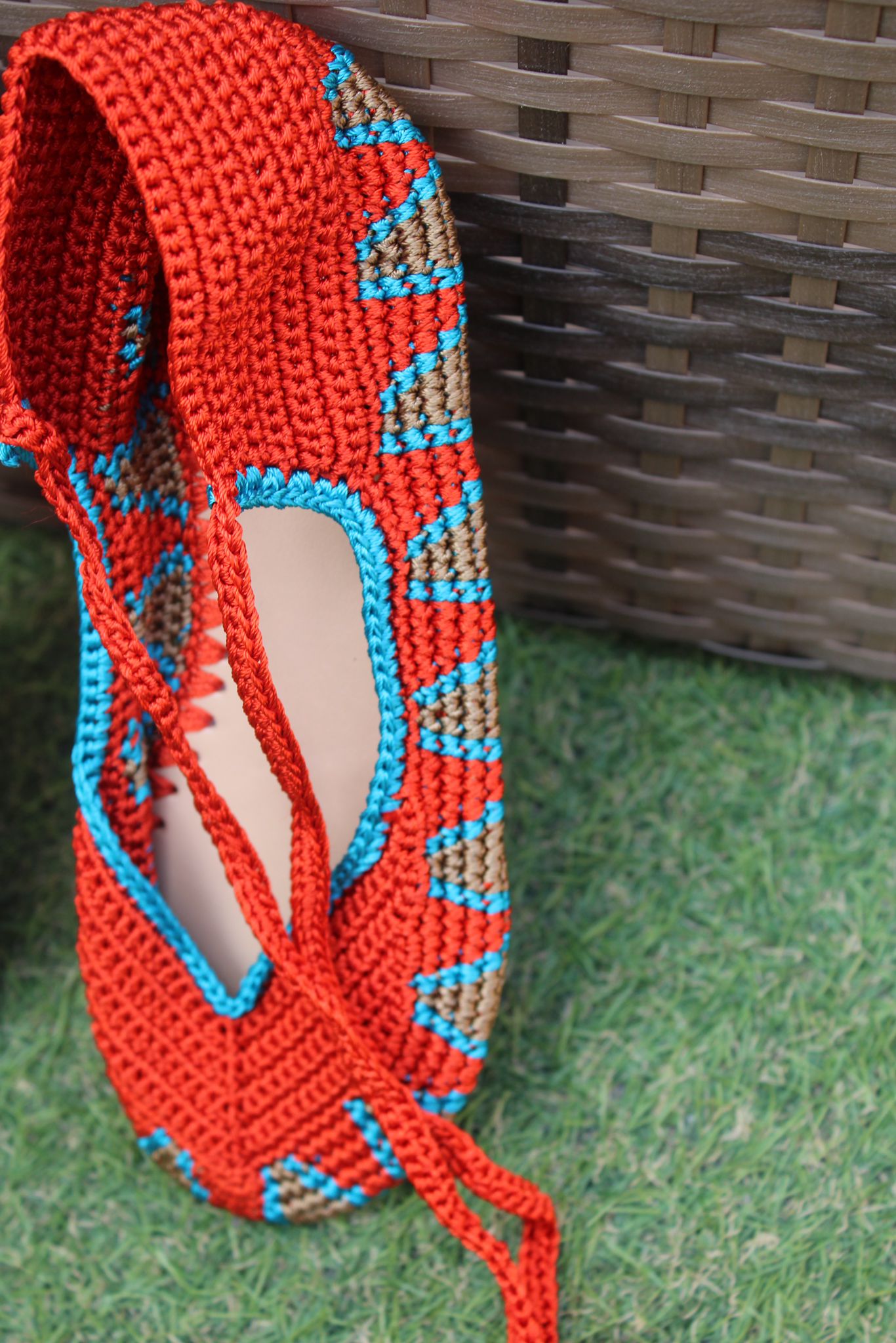 Bailarinas planas de punto crochet tejidas a mano en color caldera anaranjado, celeste y marrón, sin cuerdas. Están realizadas en algodón y rayón teñidos a mano con tintes naturales. La plantilla interior es de cuero, y la suela de cuero y goma. Se ajustan muy bien al pie, son realmente cómodas.