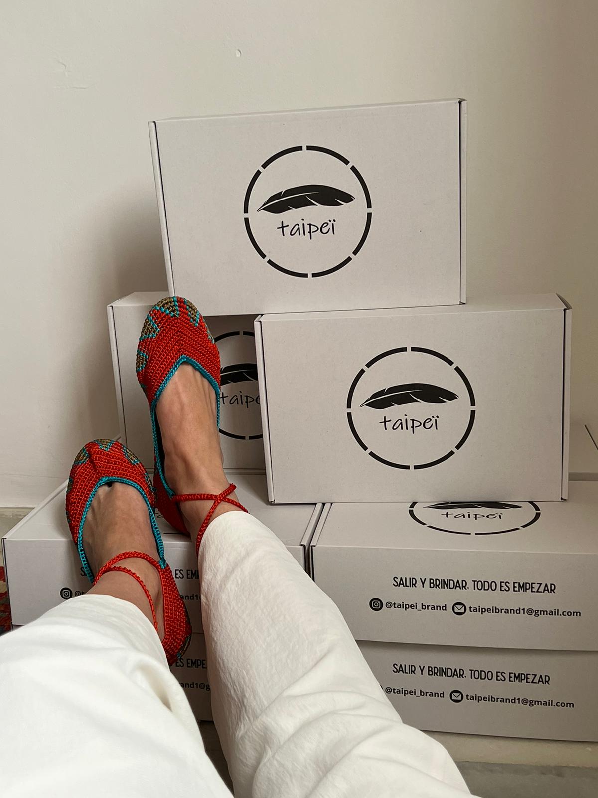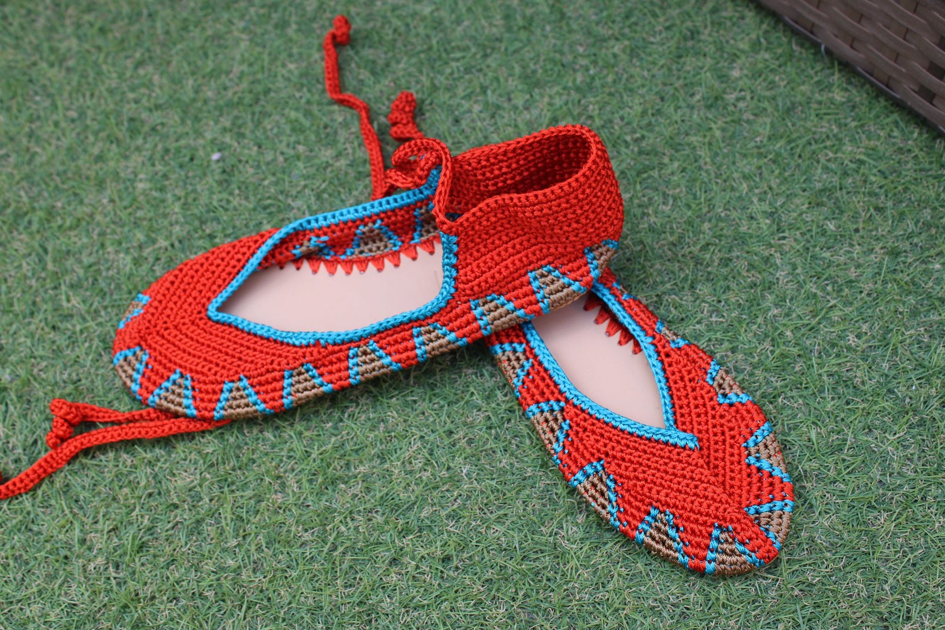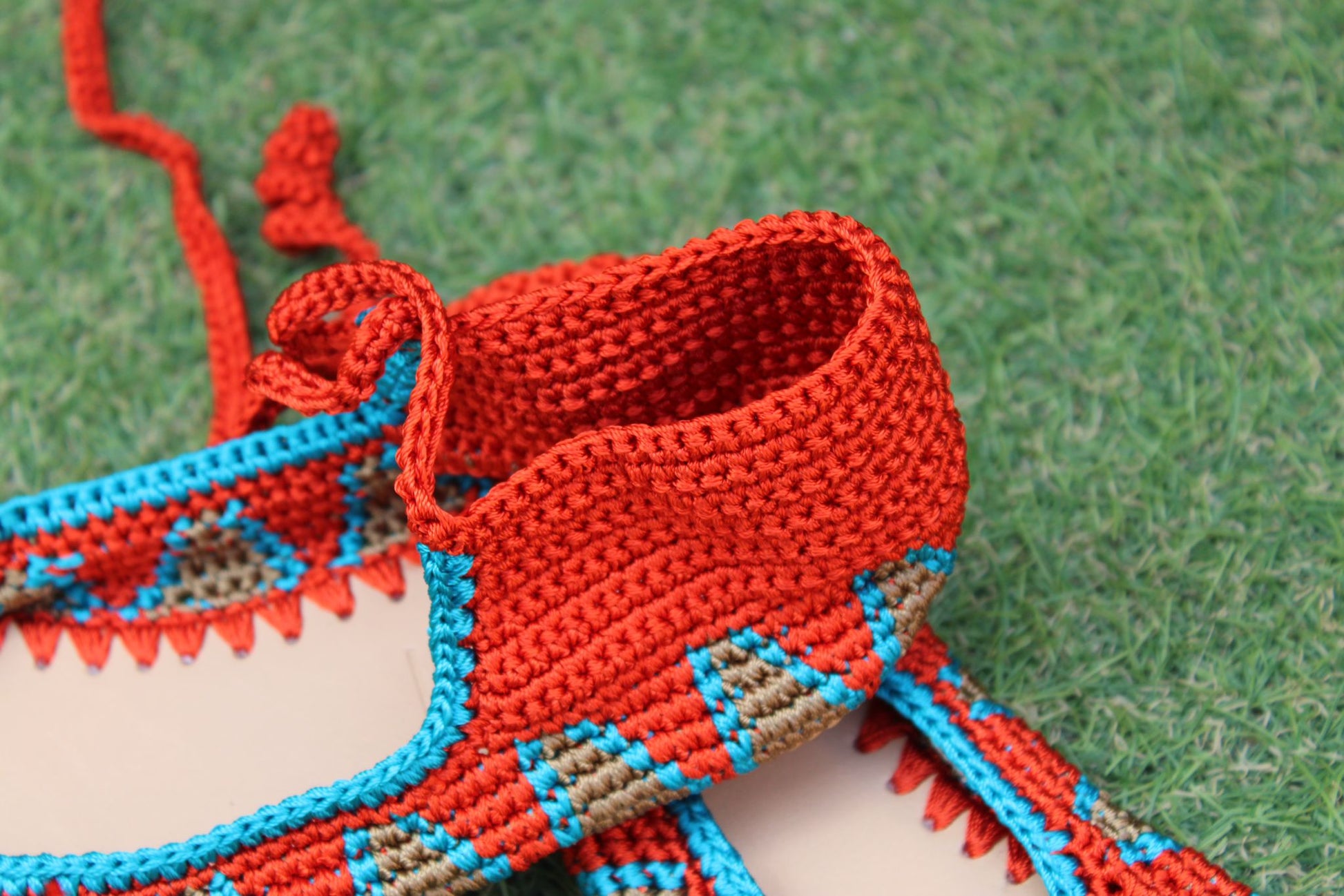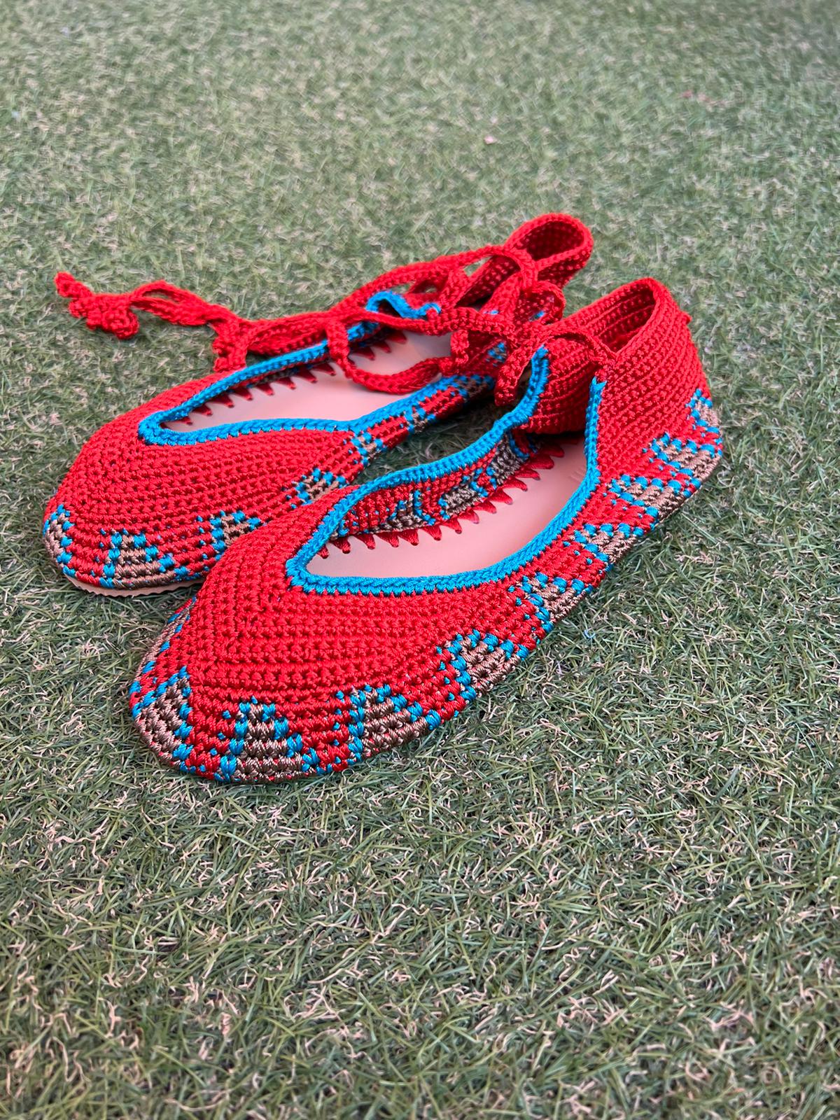 Bailarinas planas de punto crochet tejidas a mano en color caldera anaranjado, celeste y marrón, sin cuerdas. Están realizadas en algodón y rayón teñidos a mano con tintes naturales. La plantilla interior es de cuero, y la suela de cuero y goma. Se ajustan muy bien al pie, son realmente cómodas.