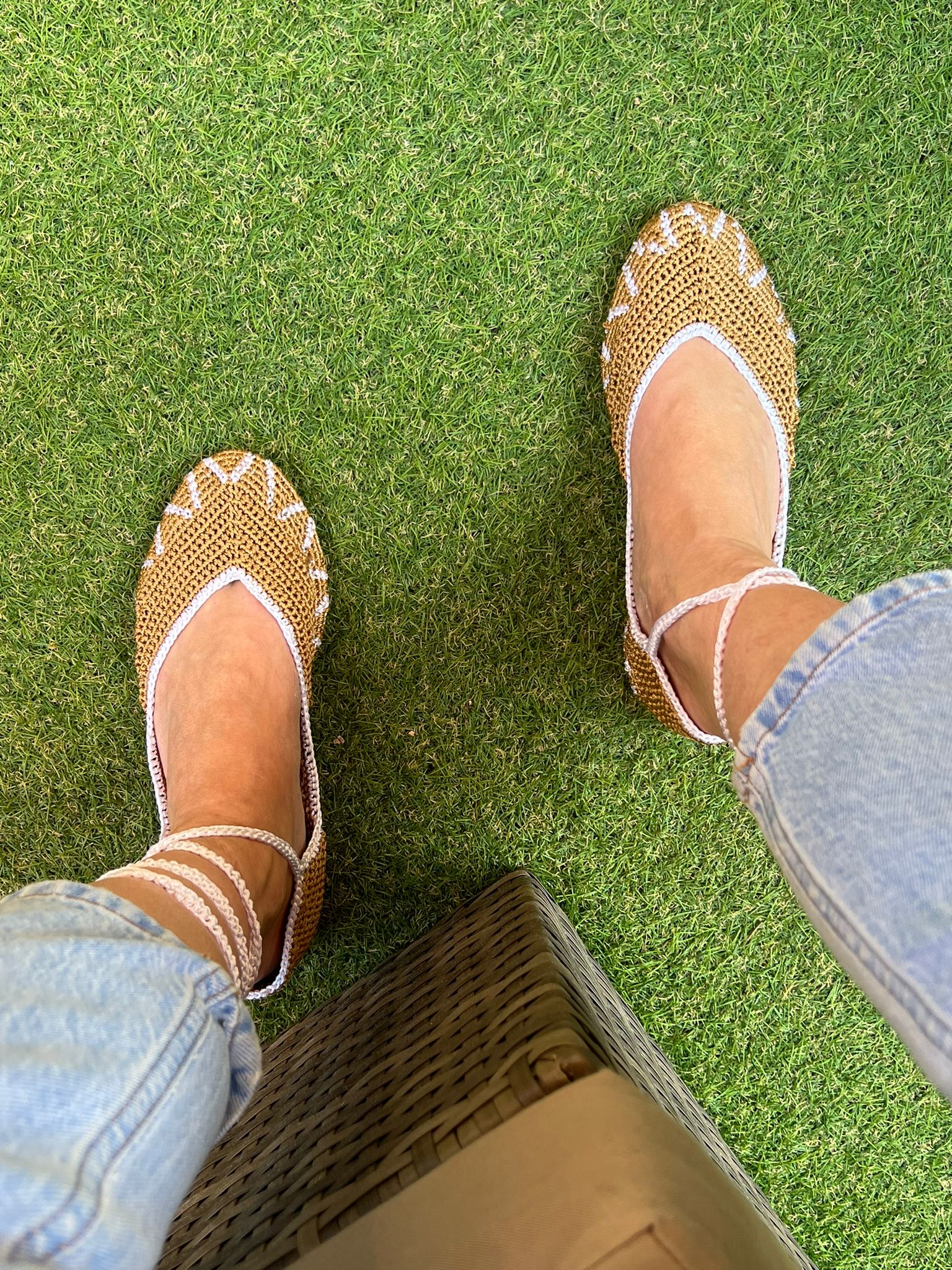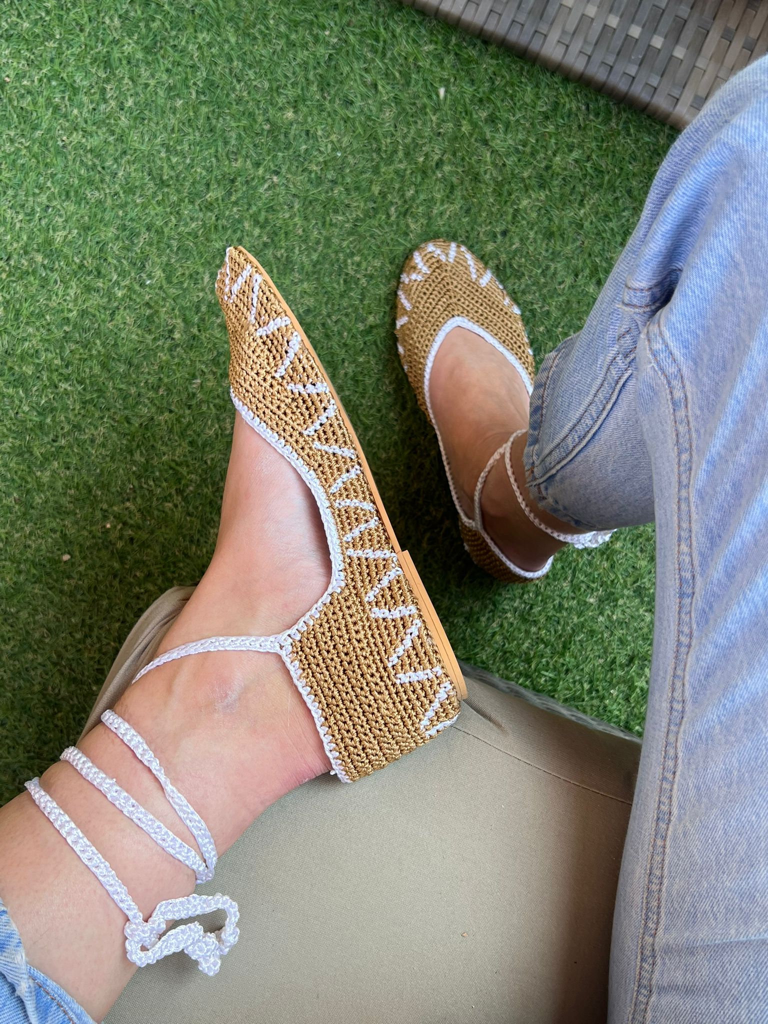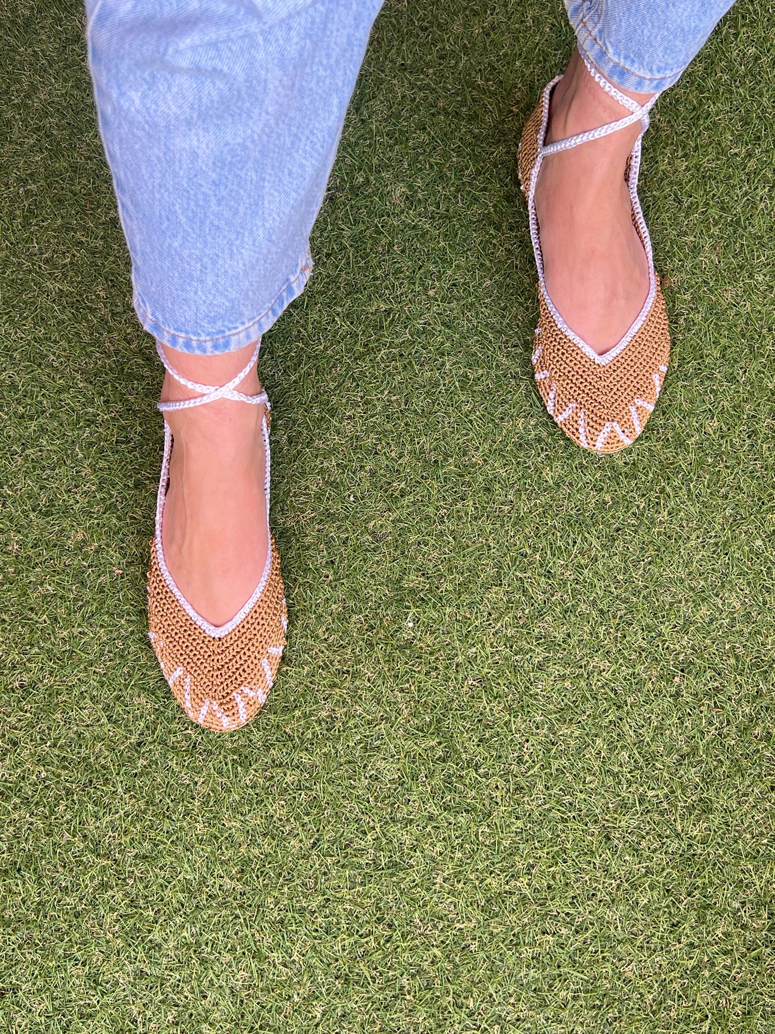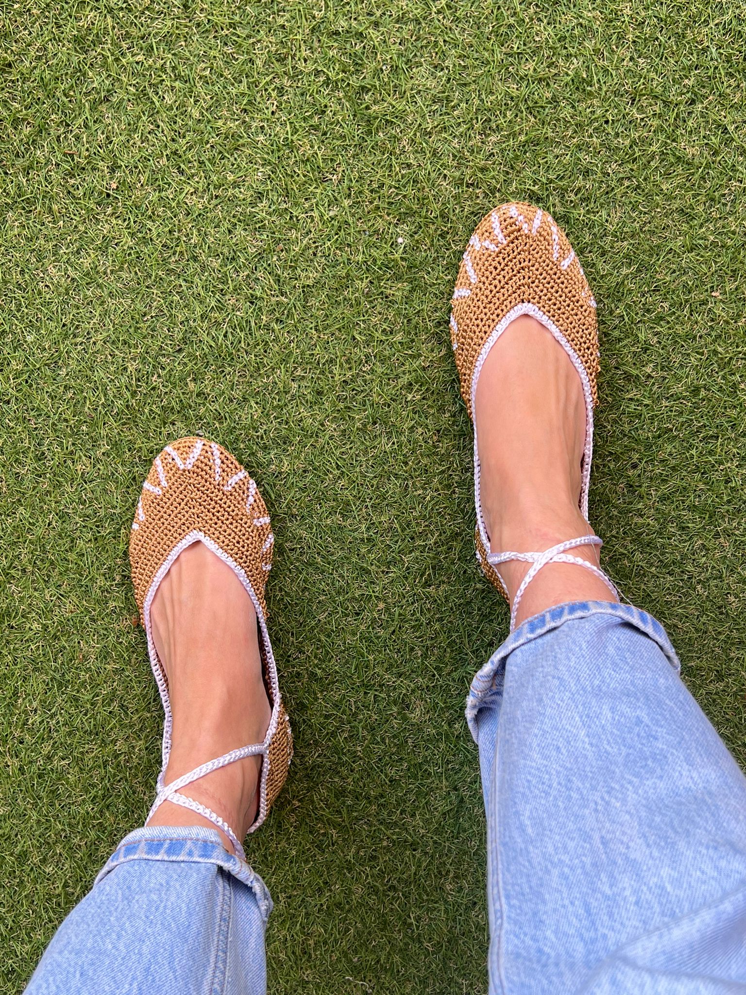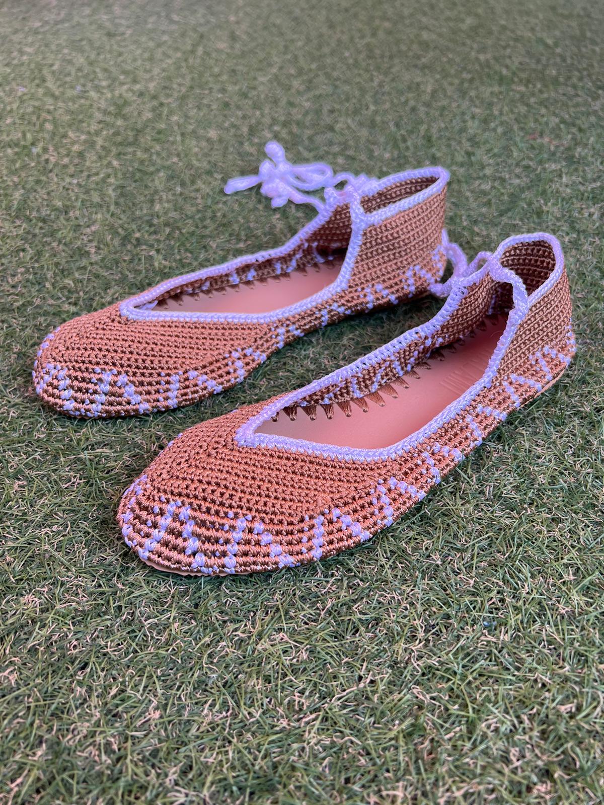 Bailarinas planas de punto crochet tejidas a mano en color marrón y crudo, con cierre de tiras romanas. Están realizadas en algodón y rayón teñidos a mano con tintes naturales. La plantilla interior es de cuero, y la suela de cuero y goma. Se ajustan muy bien al pie, son realmente cómodas.