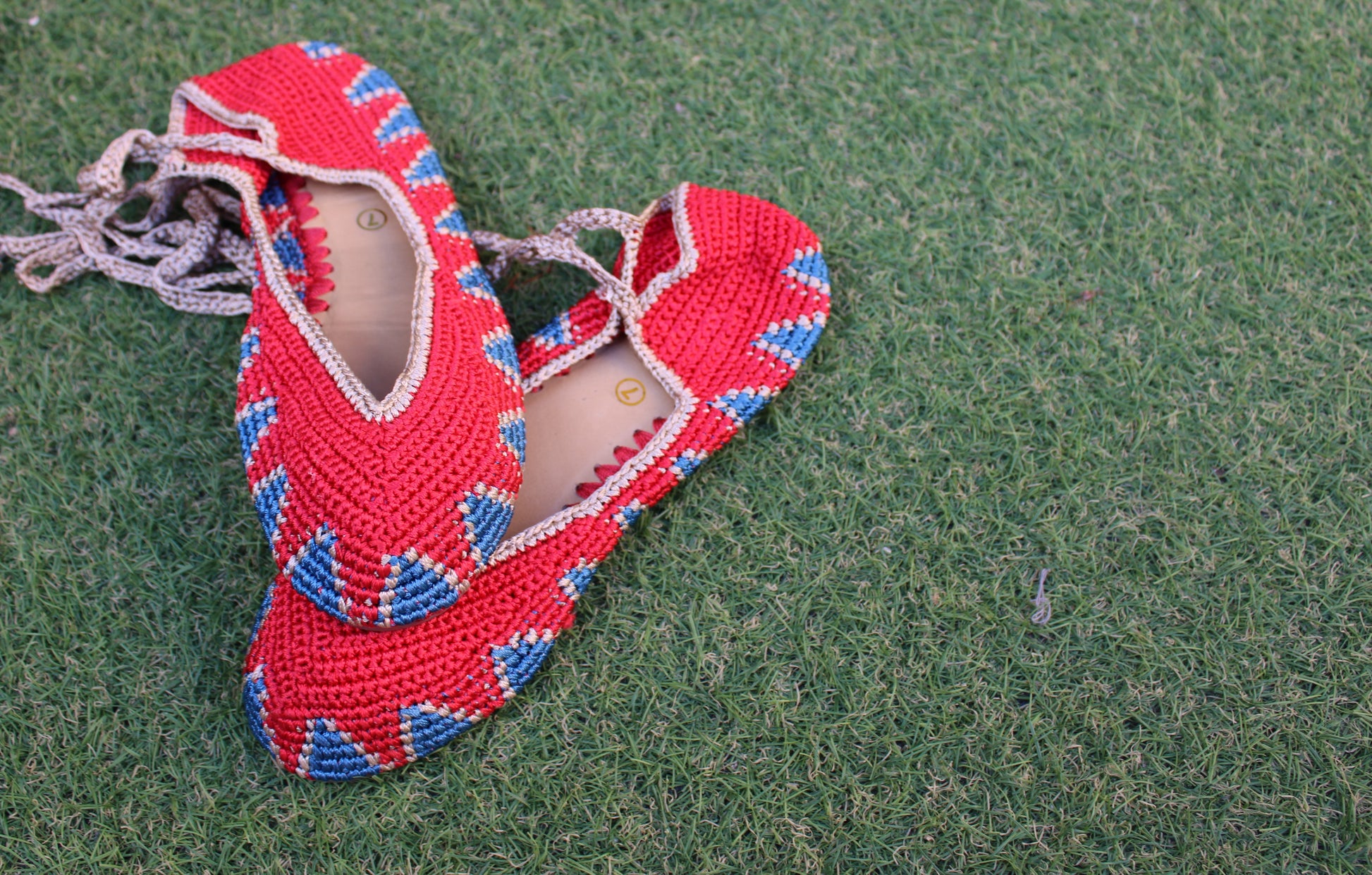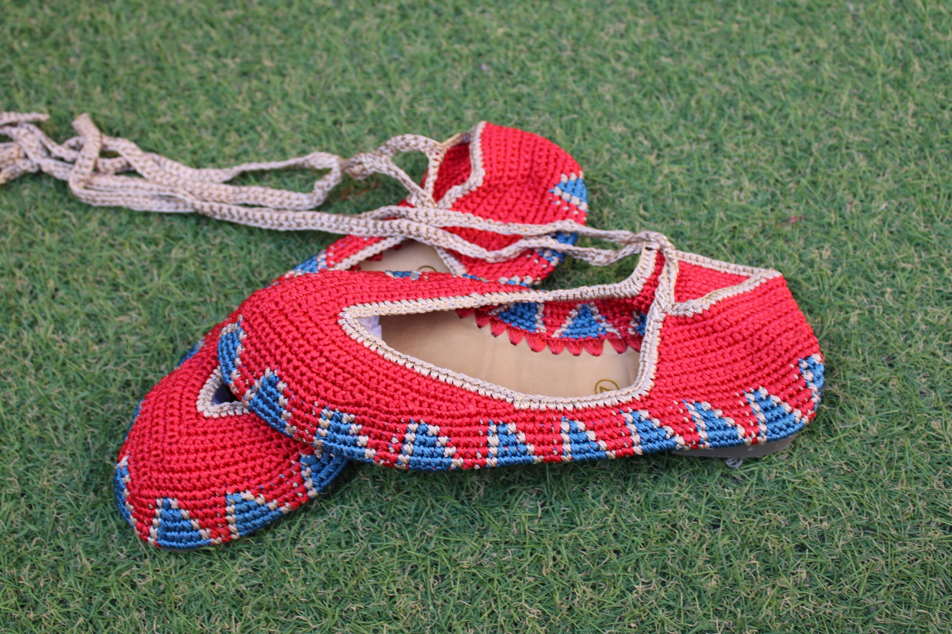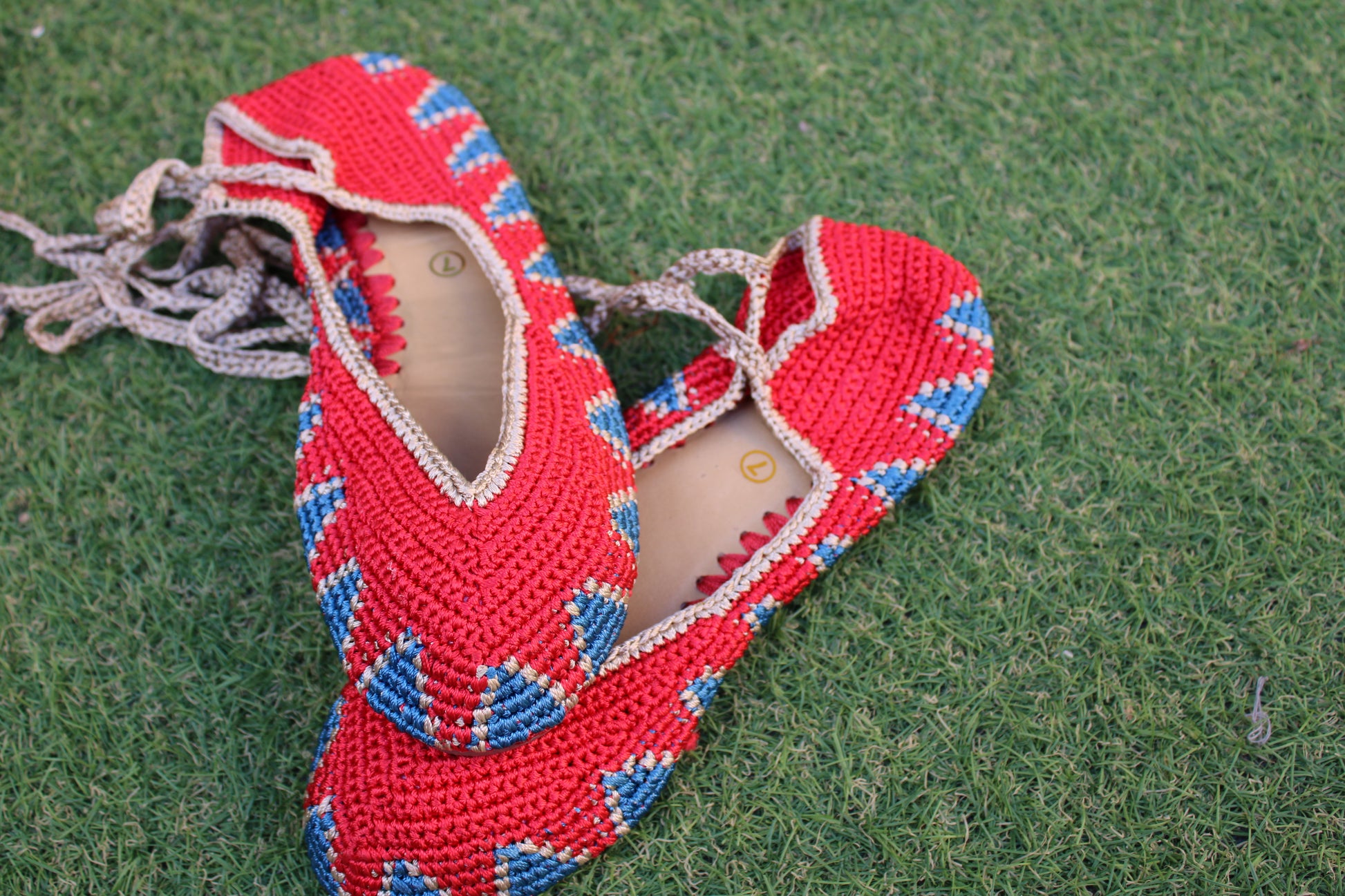 Bailarinas planas de punto crochet tejidas a mano en distintos colores, con cierre de tiras romanas. Están realizadas en algodón y rayón teñidos a mano con tintes naturales. La plantilla interior es de cuero, y la suela de cuero y goma. Se ajustan muy bien al pie, son realmente cómodas.
