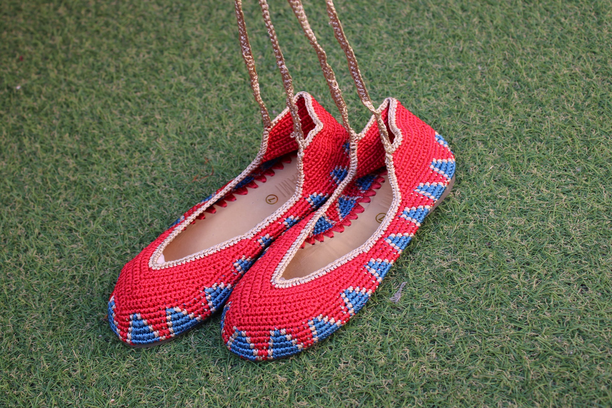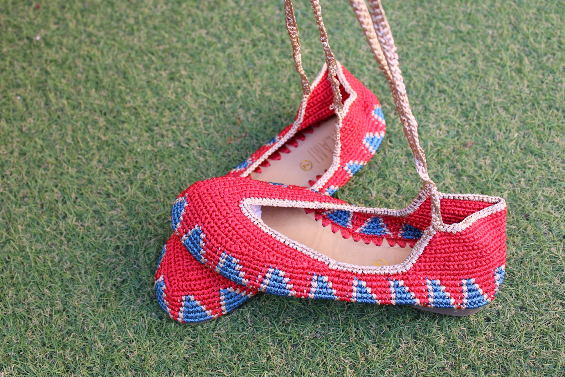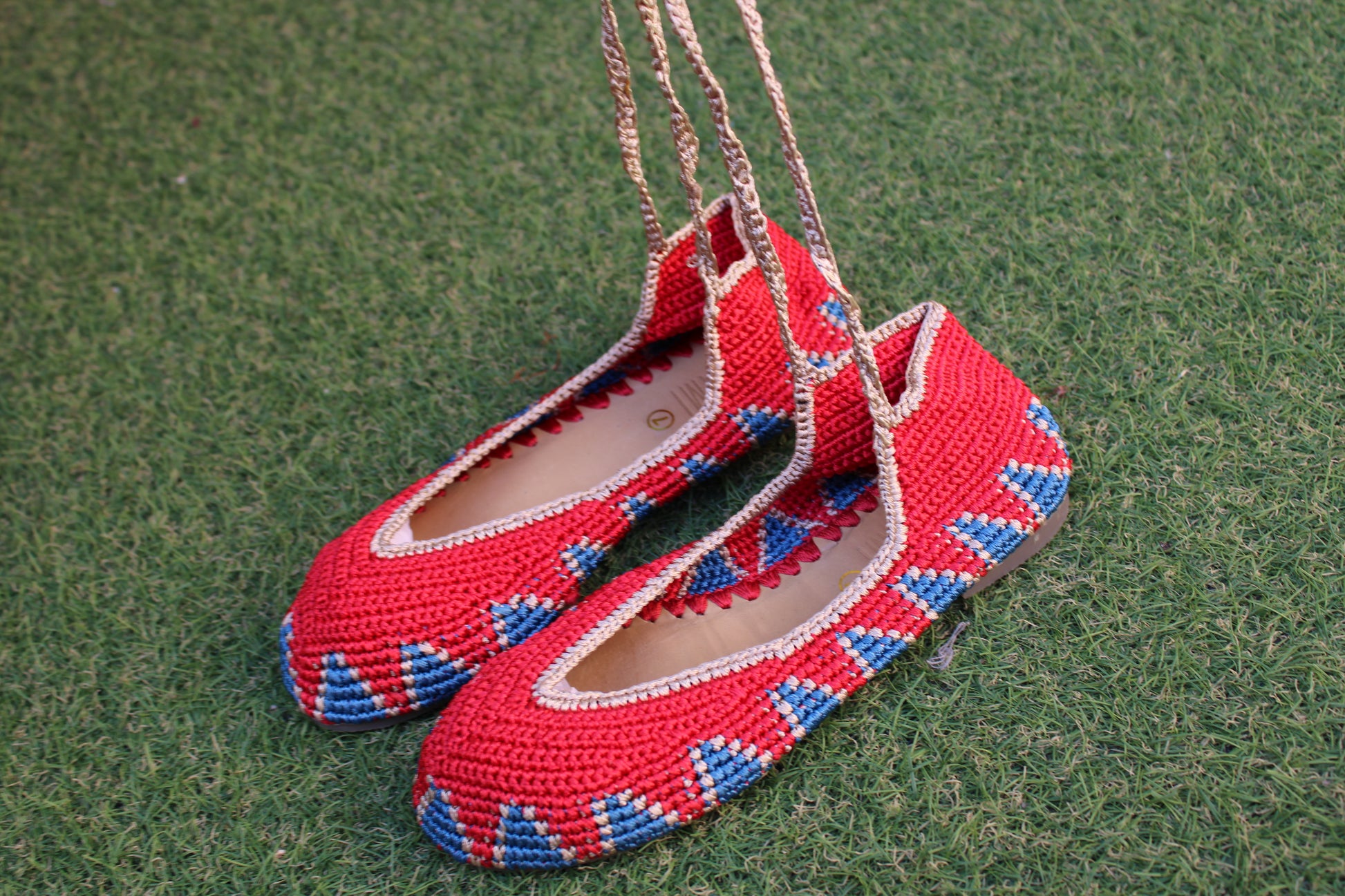 Bailarinas planas de punto crochet tejidas a mano en distintos colores, con cierre de tiras romanas. Están realizadas en algodón y rayón teñidos a mano con tintes naturales. La plantilla interior es de cuero, y la suela de cuero y goma. Se ajustan muy bien al pie, son realmente cómodas.