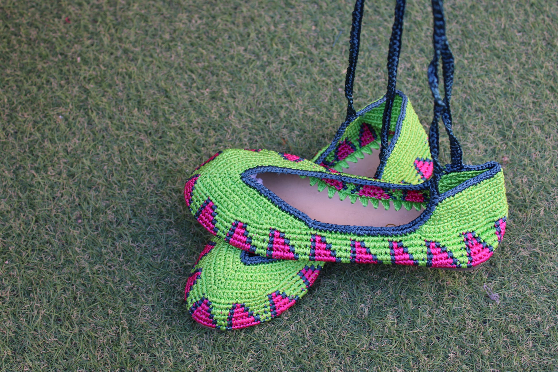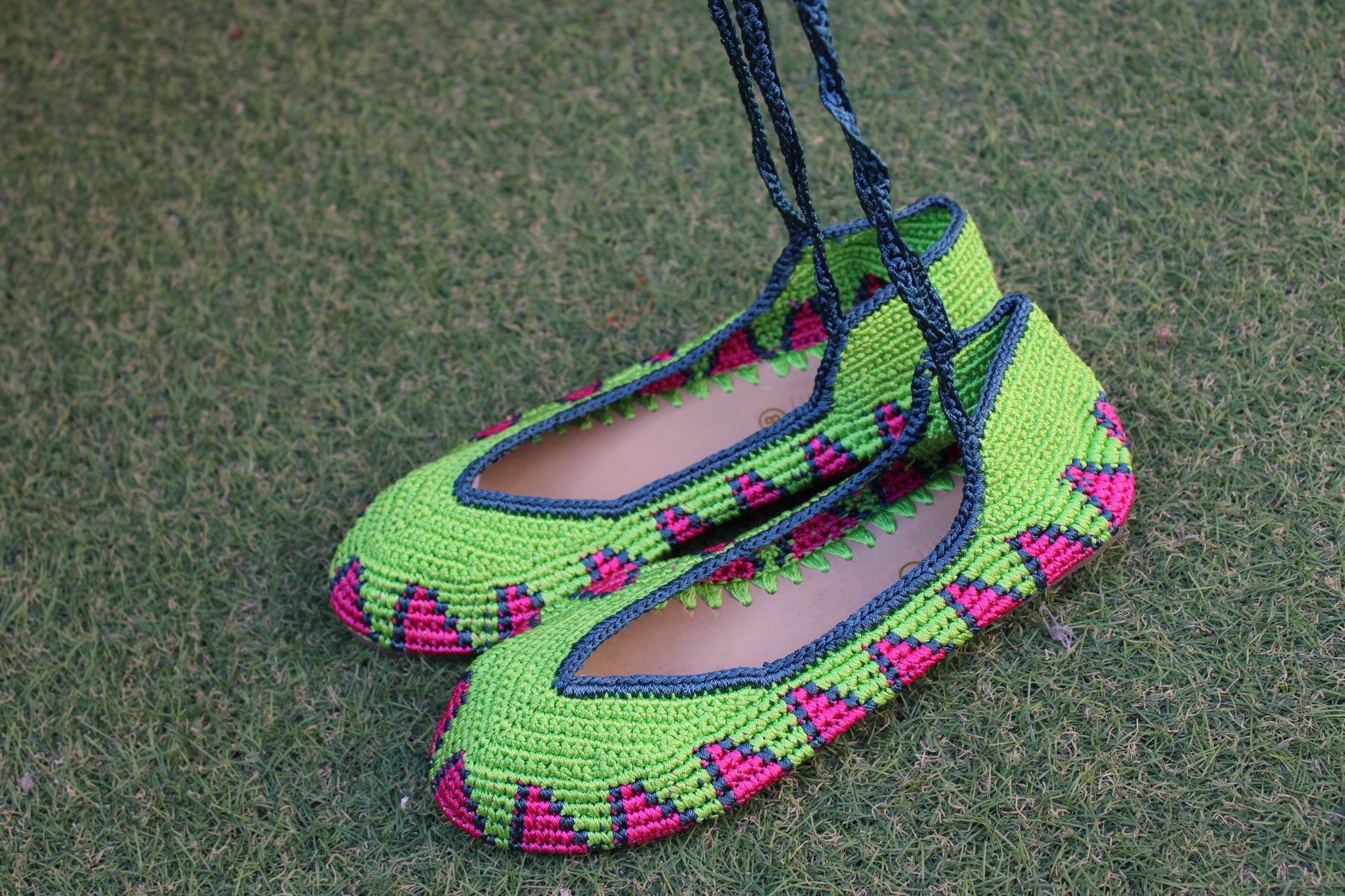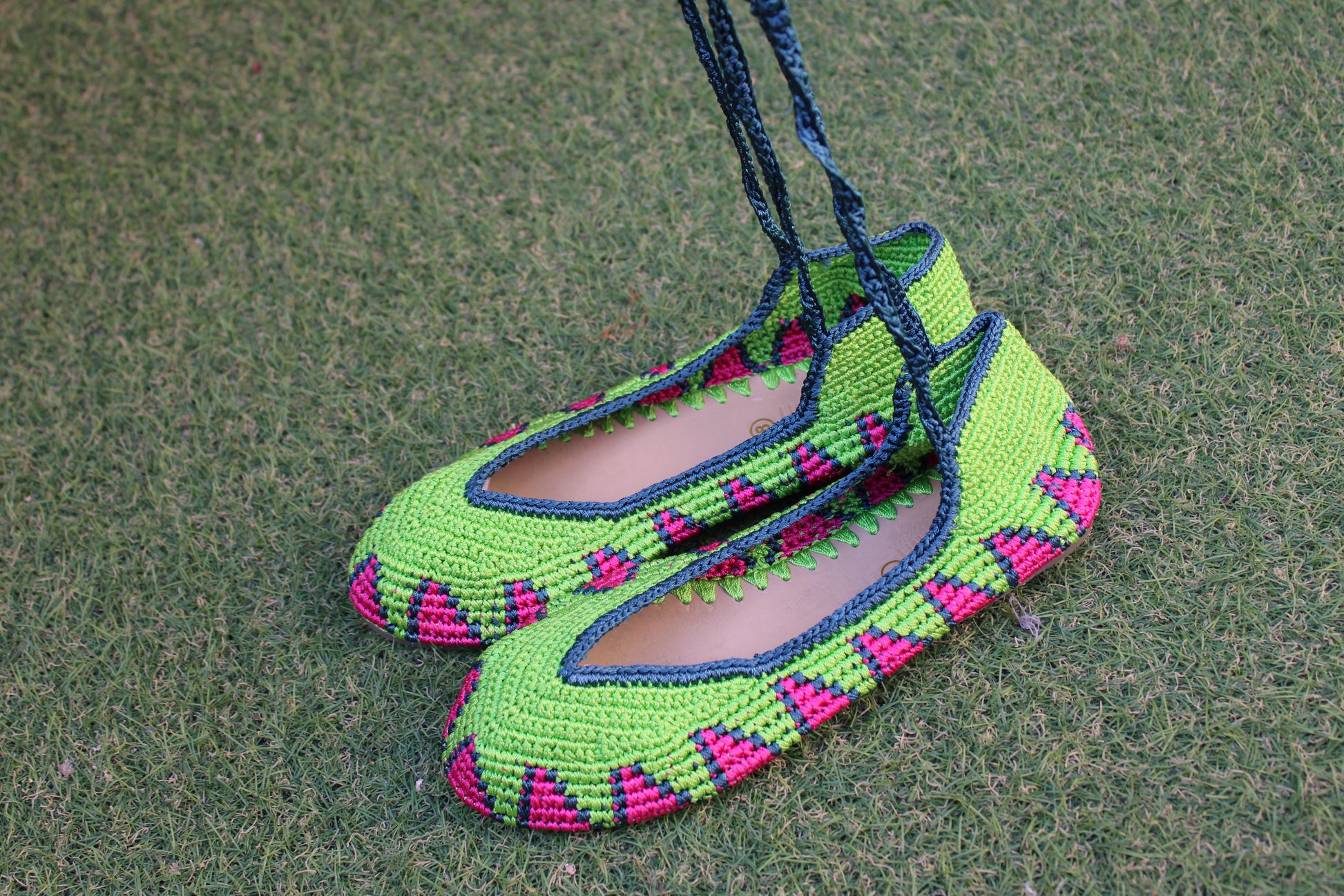 Bailarinas planas de punto crochet tejidas a mano en distintos colores, con cierre de tiras romanas. Están realizadas en algodón y rayón teñidos a mano con tintes naturales. La plantilla interior es de cuero, y la suela de cuero y goma. Se ajustan muy bien al pie, son realmente cómodas.