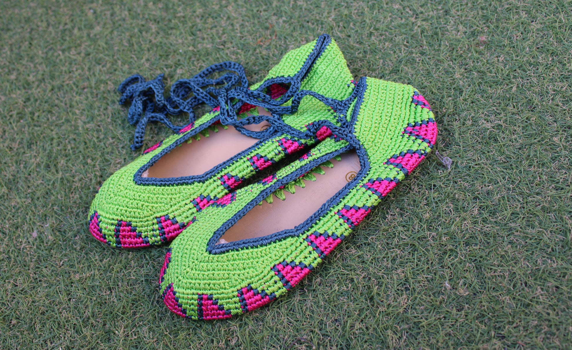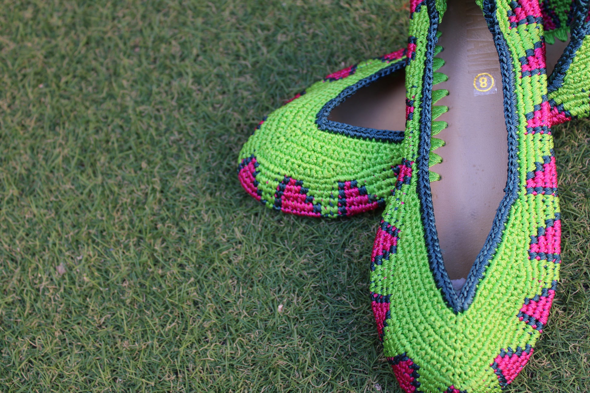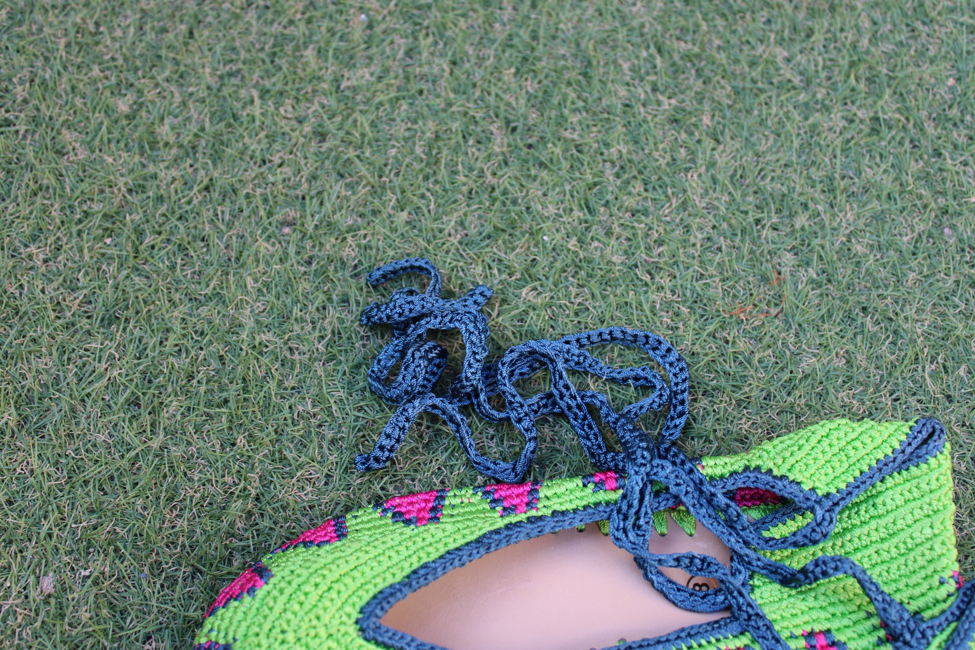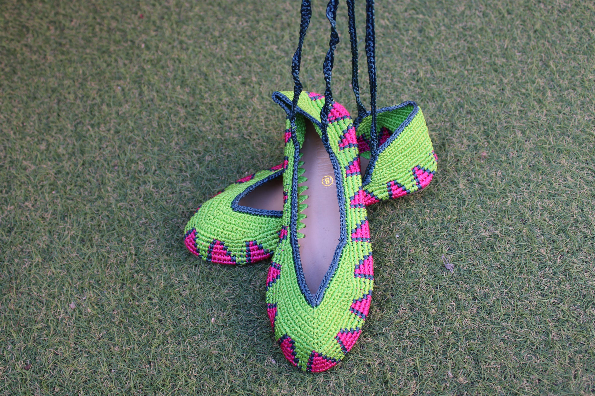 Bailarinas planas de punto crochet tejidas a mano en distintos colores, con cierre de tiras romanas. Están realizadas en algodón y rayón teñidos a mano con tintes naturales. La plantilla interior es de cuero, y la suela de cuero y goma. Se ajustan muy bien al pie, son realmente cómodas.